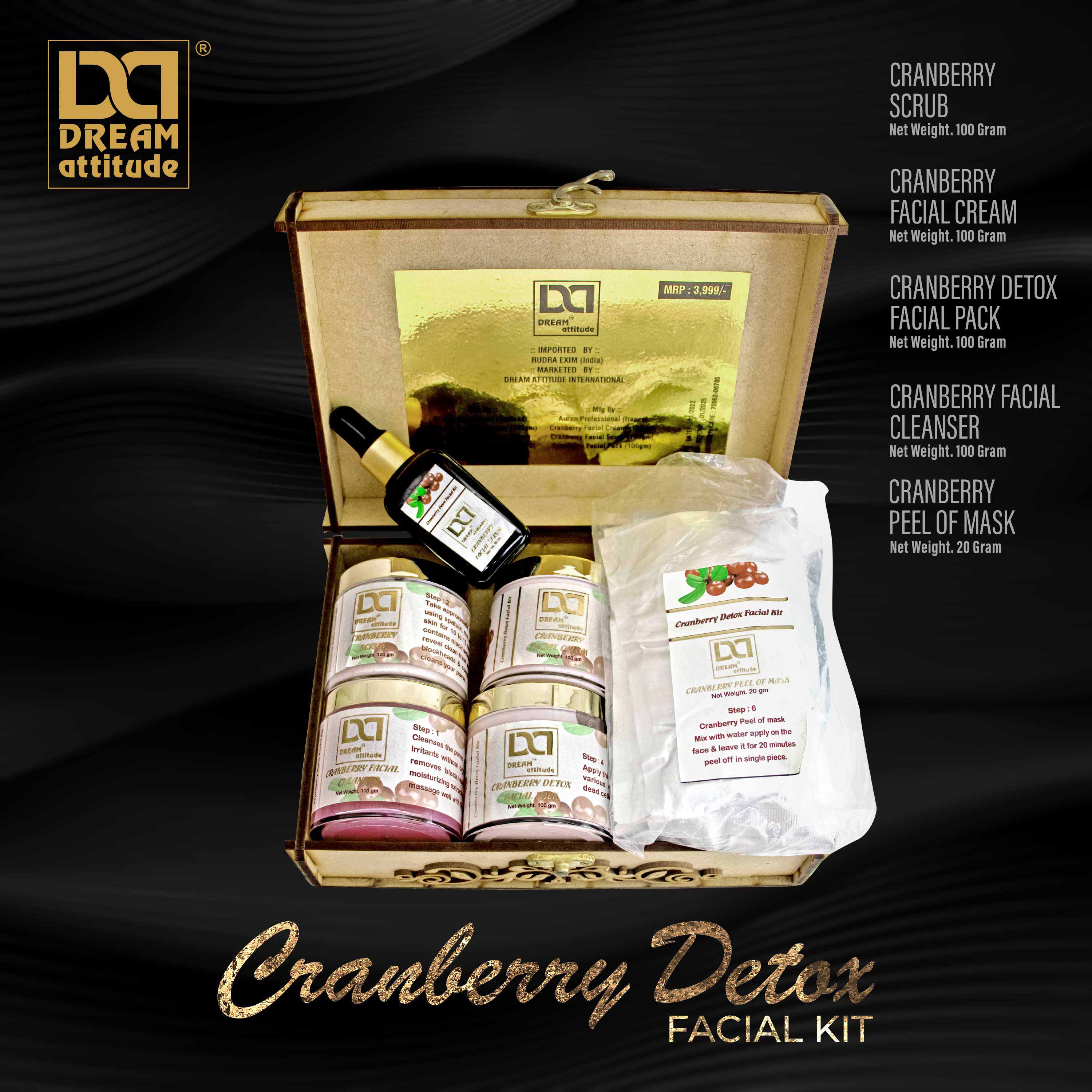 Introducing the Cranberry Detox Facial Kit by DREAM attitude, a luxurious professional facial kit meticulously crafted to provide the best facial experience for both men and women. Enriched with cranberry extracts, this facial treatment offers a holistic approach to skincare, targeting impurities and promoting a healthy glow. Indulge in a multi-step regimen that deeply cleanses and nourishes your skin, leaving it refreshed and revitalized. Whether you're seeking a face care kit for daily maintenance or the best facial kit for glowing skin, our Cranberry Detox Facial Kit is your answer to achieving radiant and flawless complexion. Elevate your skincare routine with DREAM attitude and unlock the secret to impeccable skin.